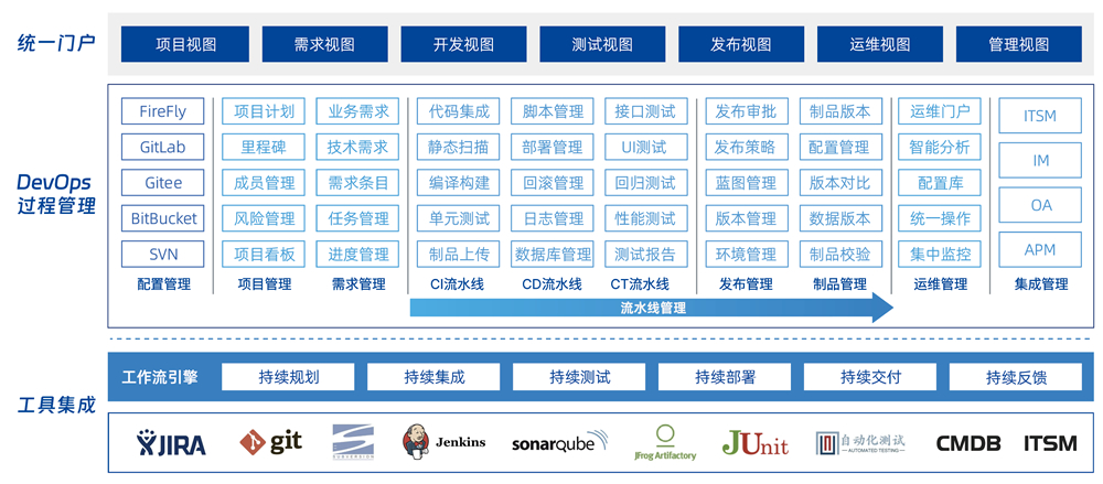 開發交付過程規范化/自動化,確保管理規范的有效執行,代碼質量檢測、單元測試自動化,減輕開發人 員工作的同時,規范開發工作過程。