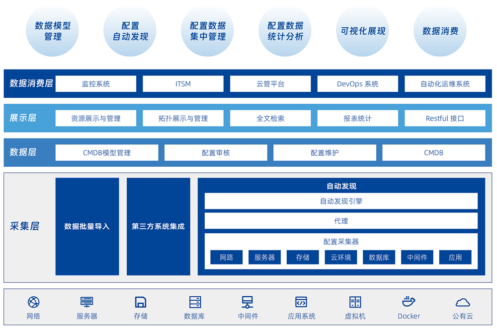 幫助用戶建立統一的運維主數據,通過各種自動化手段實現以應用為核心的全面資源管理以及運維消費場景共享。系統具備靈活的 CMDB 分層建模和配置信息維護機制,可以提供面向業務的 IT 架構畫像,為各個運維工具提供集中化的資源信息管理和協同,為 IT 運維和 DevOps 體系下的各種運維場景提供數據消費服務。