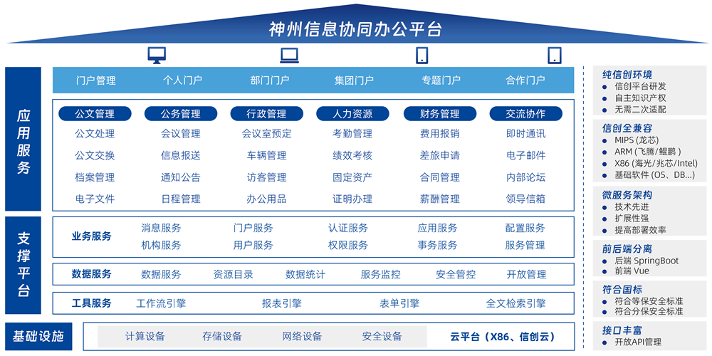 基于微服務應用架構設計的一體化辦公平臺,采用前后端分離的開發模式,支持在龍芯、鯤鵬、飛騰、兆芯等芯片的國產服務器安裝部署,能夠為企業提供豐富的協同功能應用,滿足客戶多樣化、場景化、個性化的應用需求,助力中大型與集團企業客戶實現數字化轉型升級。