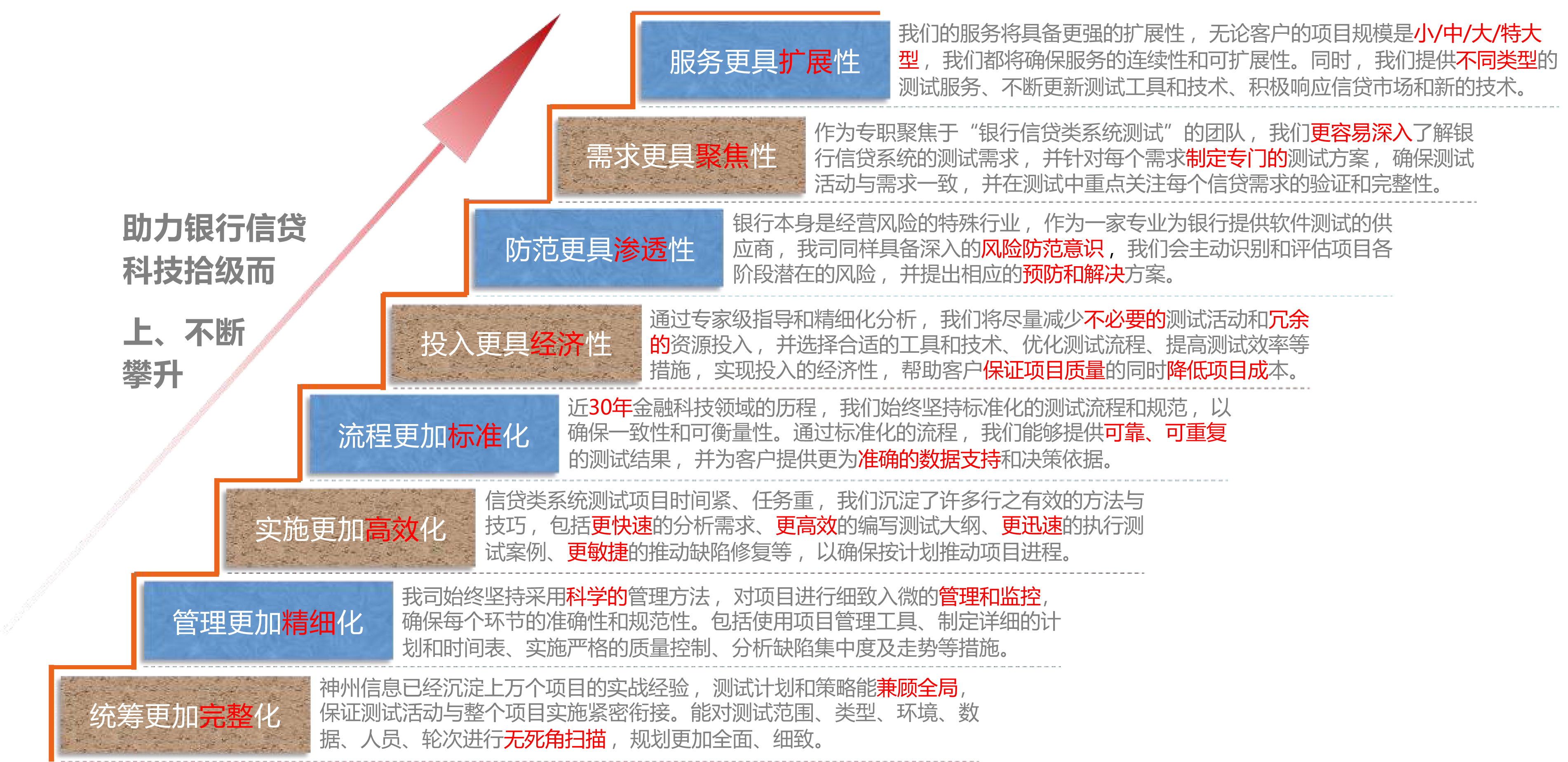 完善的測試管理體系,及優(yōu)質(zhì)、全面的測試服務(wù),以高標(biāo)準(zhǔn)監(jiān)控項目實施各個階段,確保信貸類系統(tǒng)測試項目得以高質(zhì)量的完成。